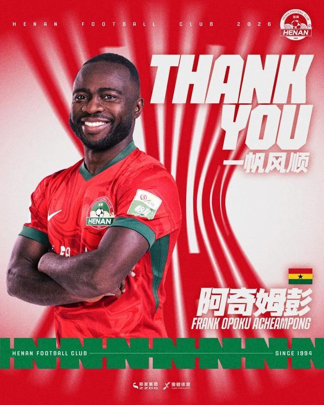 1月12日晚间,河南足球俱乐部发布公告,球员阿奇姆彭、卡多索、尹鸿博、牛梓屹、黄紫昌、刘斌、卢永涛、何小珂、宋润潼、张智豪合同到期,正式离队。